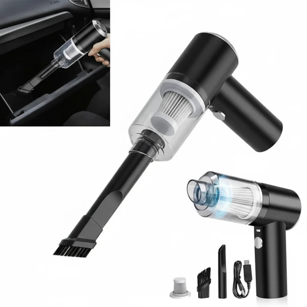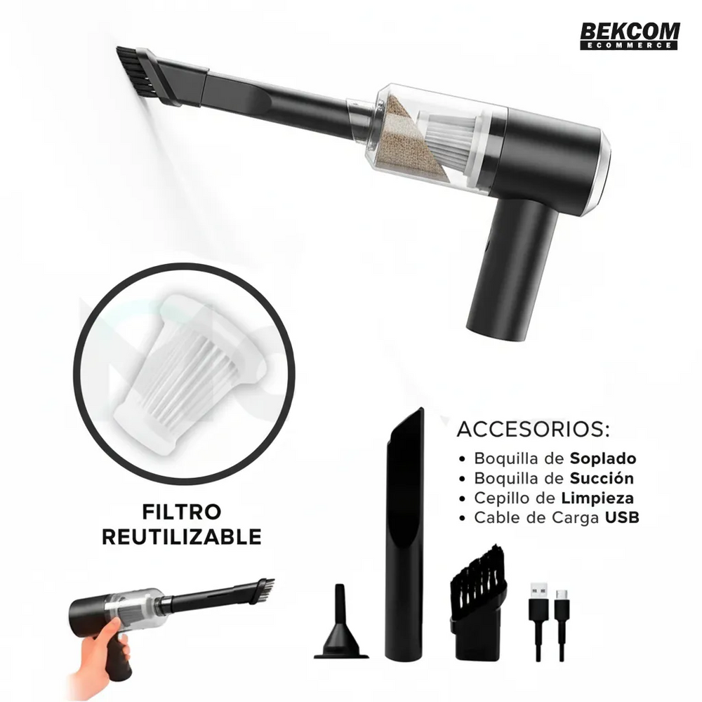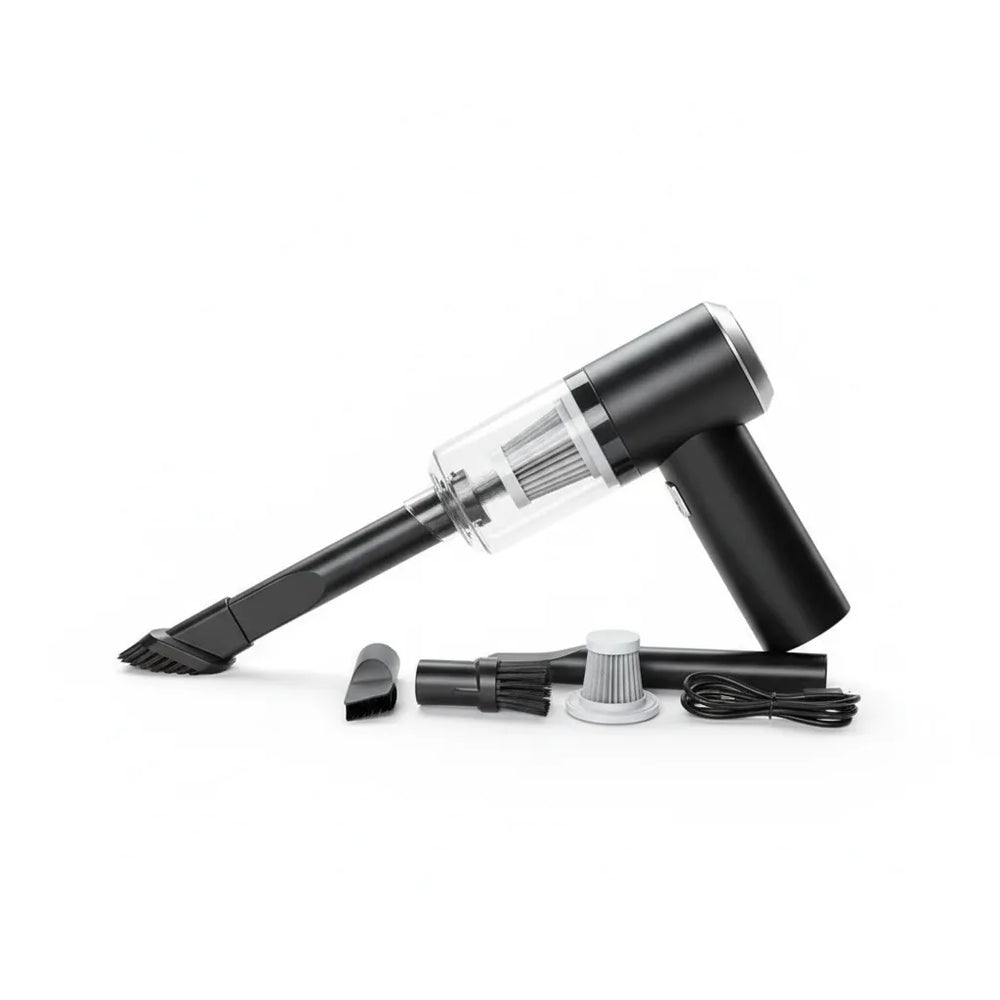 Mantén tu auto impecable con nuestra aspiradora de auto inalámbrica compacta y potente, diseñada para llegar a esos espacios reducidos que son difíciles de limpiar. Con accesorios especializados, esta aspiradora es perfecta para limpiar cada rincón, desde el baúl hasta los asientos y las ranuras de difícil acceso.